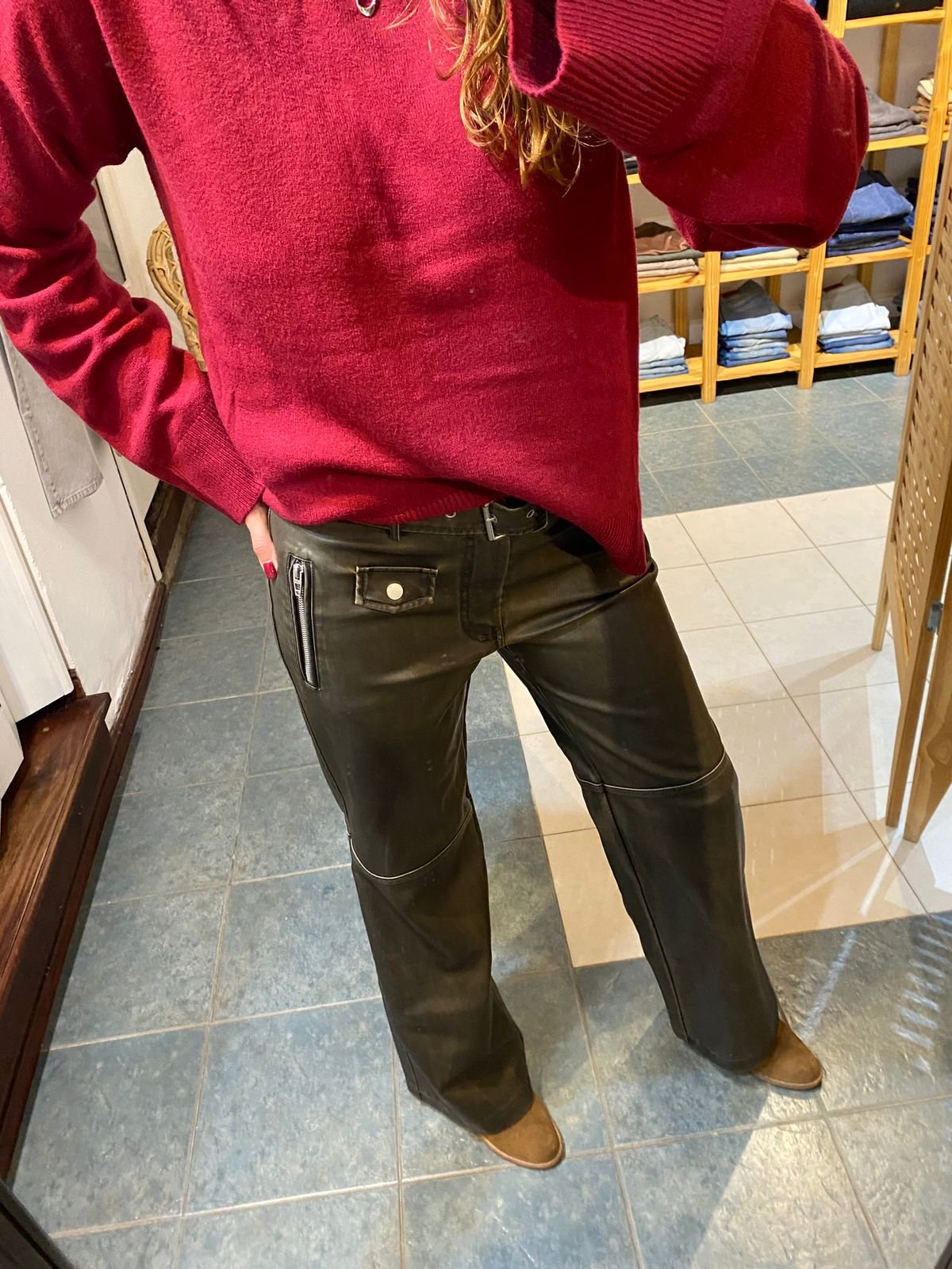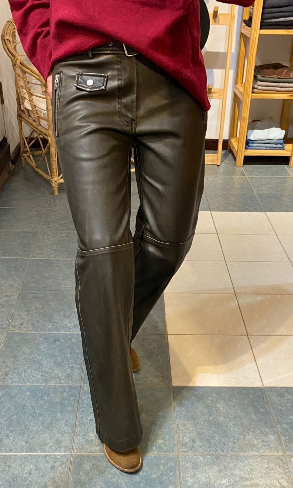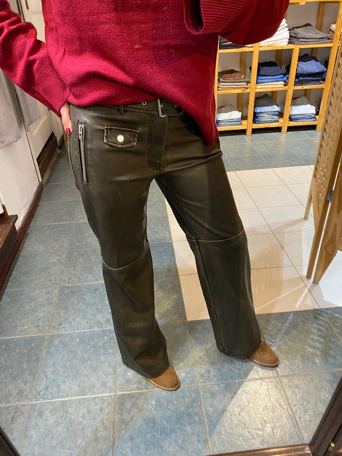 Eco Cuero con cinturon y cierre en lateral.